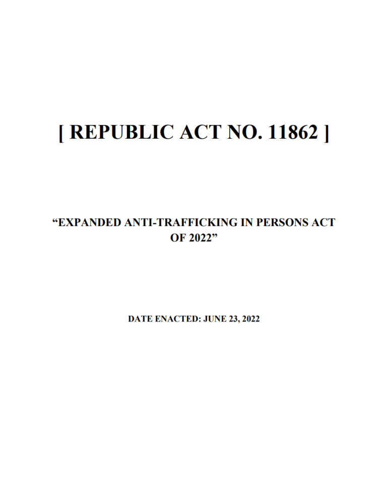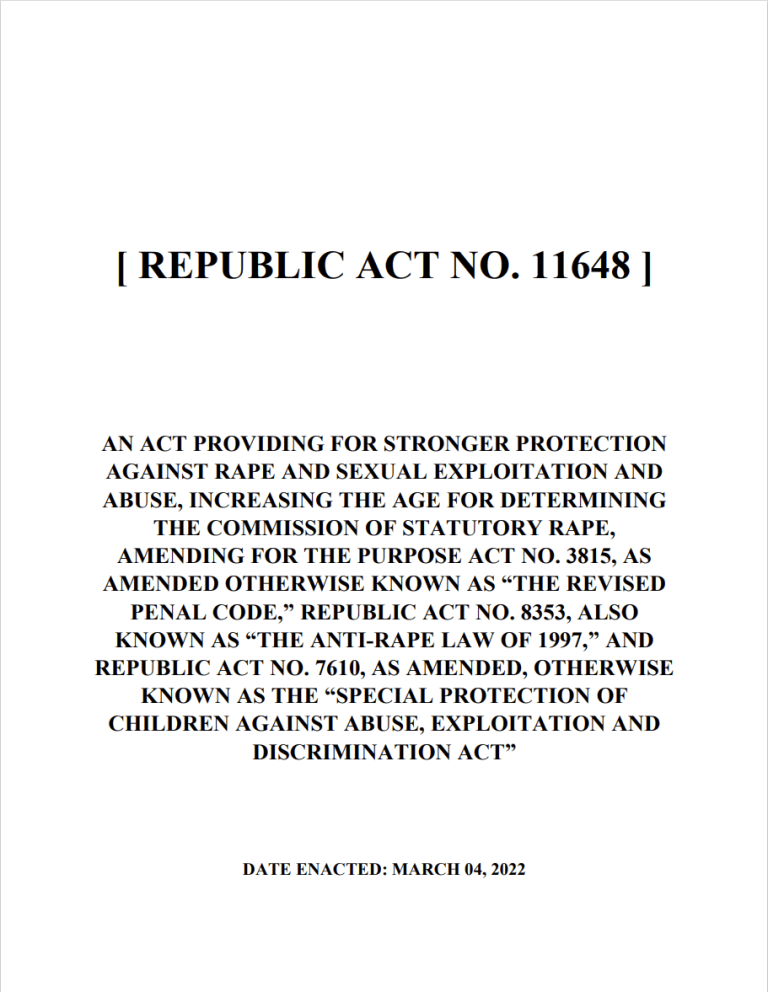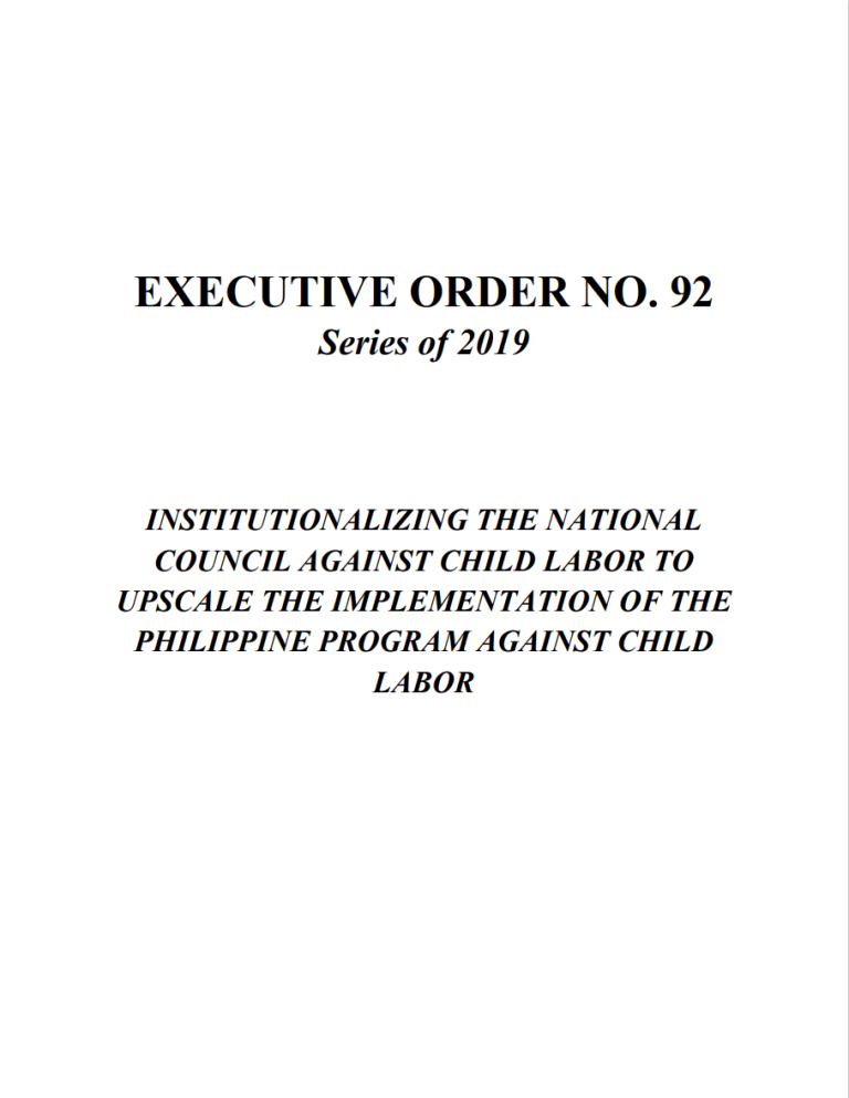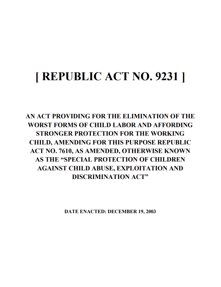 Laws and Issuances Search for: International Instruments ASEAN Roadmap on the Elimination of the Worst Forms of Child Labour by 2025 Read More Durban Call to Action on the Elimination of Child Labour, 5th Global Conference on the Elimination of Child Labour Read More U.N Convention on the Rights of the Child Read More ILO Convention No. 138 (Minimum Age Convention, 1973) Read More Load More View More National Laws Republic Act No. 9231 Read More Republic Act No. 11930 Read More Republic Act No. 11862 Read More Republic Act No. 11648 Read More Load More View More DOLE Issuances Domestic Workers Act or Batas Kasambahay Republic Act No. 10361 Read More Labor Advisory No. 18, Series of 2023 Read More Department Circular No. 02, Series of 2018 Read More Department Circular No. 02, Series of 2017 Read More Load More View More Other Issuances DILG Memorandum Circular No. 2021-039 Read More DILG Memorandum Circular No. 2019-73 Read More Executive Order No. 92, Series of 2019 Read More DENR Memorandum on the Intensification of the Intent of EO92 Read More Load More View More Other Laws View More